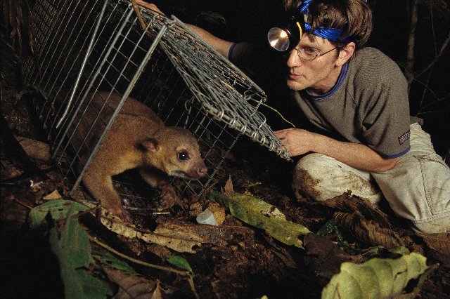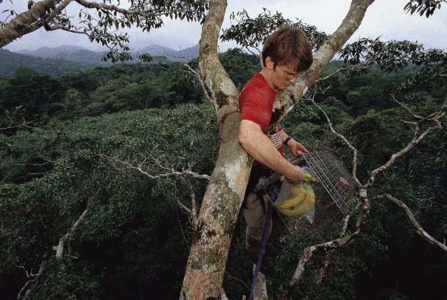 bates a cage with bananas 100 ft. up in fig tree. Kays studies kinkajous, and