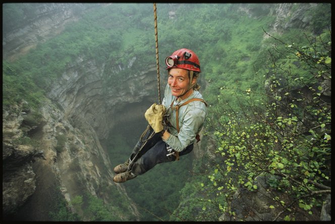Attair, a 200-meter deep sinkhole.Biologist Nancy Pistole ascends Tawi Attair,