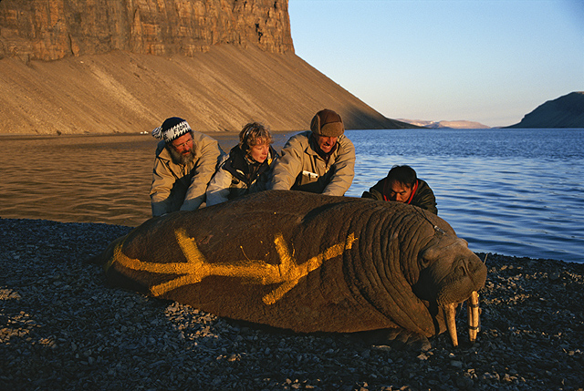 repositions a tranquilized and tagged Atlantic walrus.