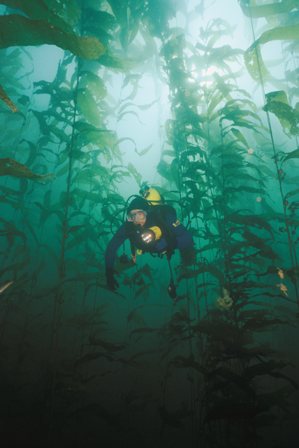 A diver exploring a forest of
