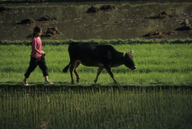Description: Young girl herds cows