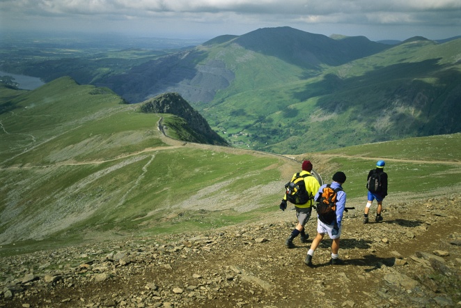 Description: Hikers on a trail high