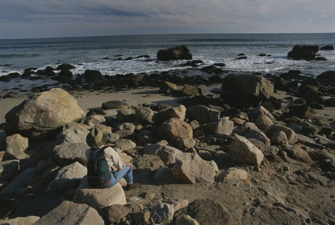 sits on a rocky beach and watchs the surf.