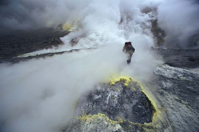 fumaroles on a sulfur-encrusted crater.
