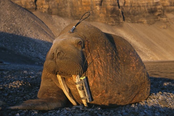 walruss tusk and the VHF transmitter is on its head. The walrus is still drowsy