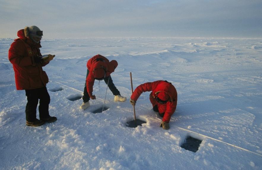 and ice thickness on the frozen sea. The scientist on the right measures the