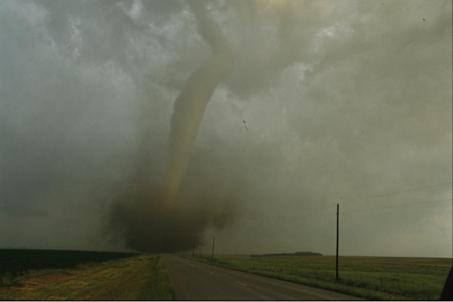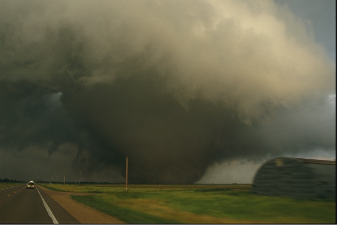 tornado rampages towards a storm chasers van. Photograph taken on June 24,