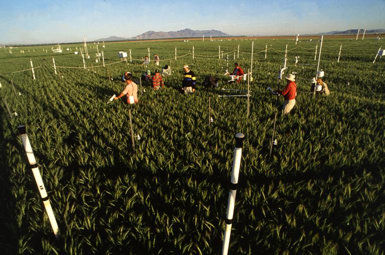 Near Phoenix, Arizona, scientists measure the growth of wheat surrounded by