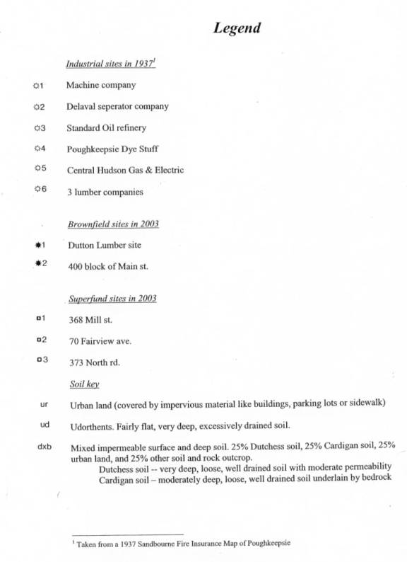 The difficulty in finding information about owners and development plans for possibly contaminated sites made our search for information on Poughkeepsie’s brownfields frustrating. The limited information we found about current brownfields demonstrates the need for a better resource base. Regardless, we now know that the Dutton Lumber site (located on the waterfront just north of Central Hudson) and the 400 block of Main Street are currently identified on the remediation process, as are three Superfund sites (Figure 1). Historical information about Poughkeepsie provided insight into places that may be considered brownfields in the future. We were able to identify past industrial use by studying historic Sanborn Fire Insurance Maps (1937), which show what industries have previously existed within the city of Poughkeepsie. The vast majority of industry was located directly on the waterfront (Figure 1). The main industries we identified were: lumber, metal, coal, oil refineries, and machinery and utility sites. Since coal, machinery manufacturing, and primary metal industry are all sites associated with chlorinated hydrocarbon pollution, the utility and industrial sites most likely caused some heavy metal contamination to the waterfront and the oil refineries probably left behind some petroleum hydrocarbons. Much of this noxious material must have run directly into the Hudson River. Some of these pollutants might possibly still be there. Considering that in the late 19th and early 20th centuries there were no Superfund laws or stringent cleanup regulations, the pollution may still be around even though some of those industries are long gone. Although it is hard to know which sites may be polluted, this historical